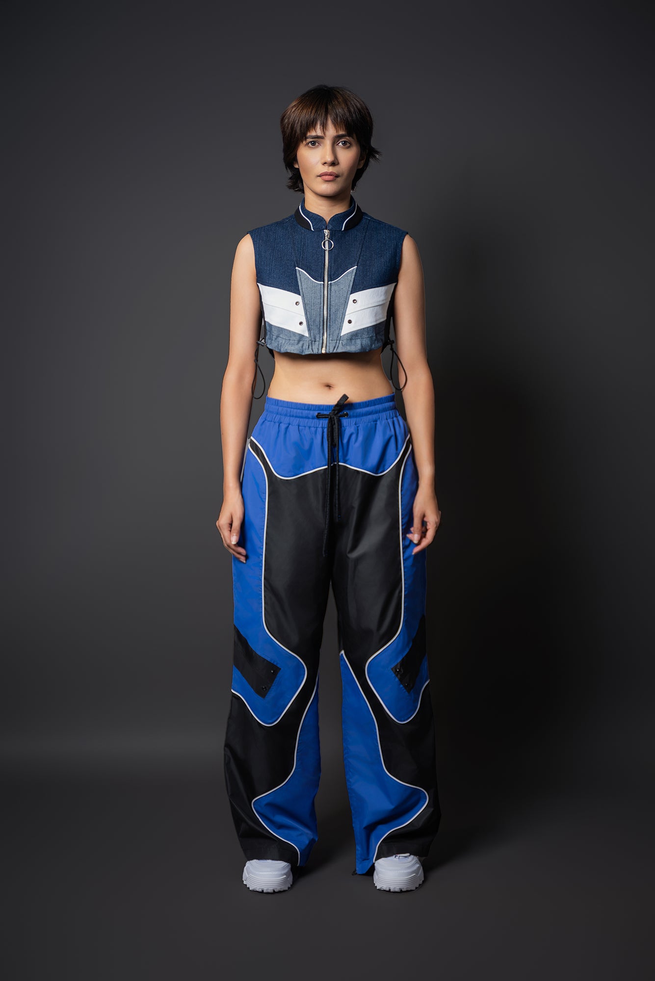 A 100% cotton based crop top with multiple denim washed panels and a bungee chord adjustment system at hem. It also features our external logo label stitched at back.