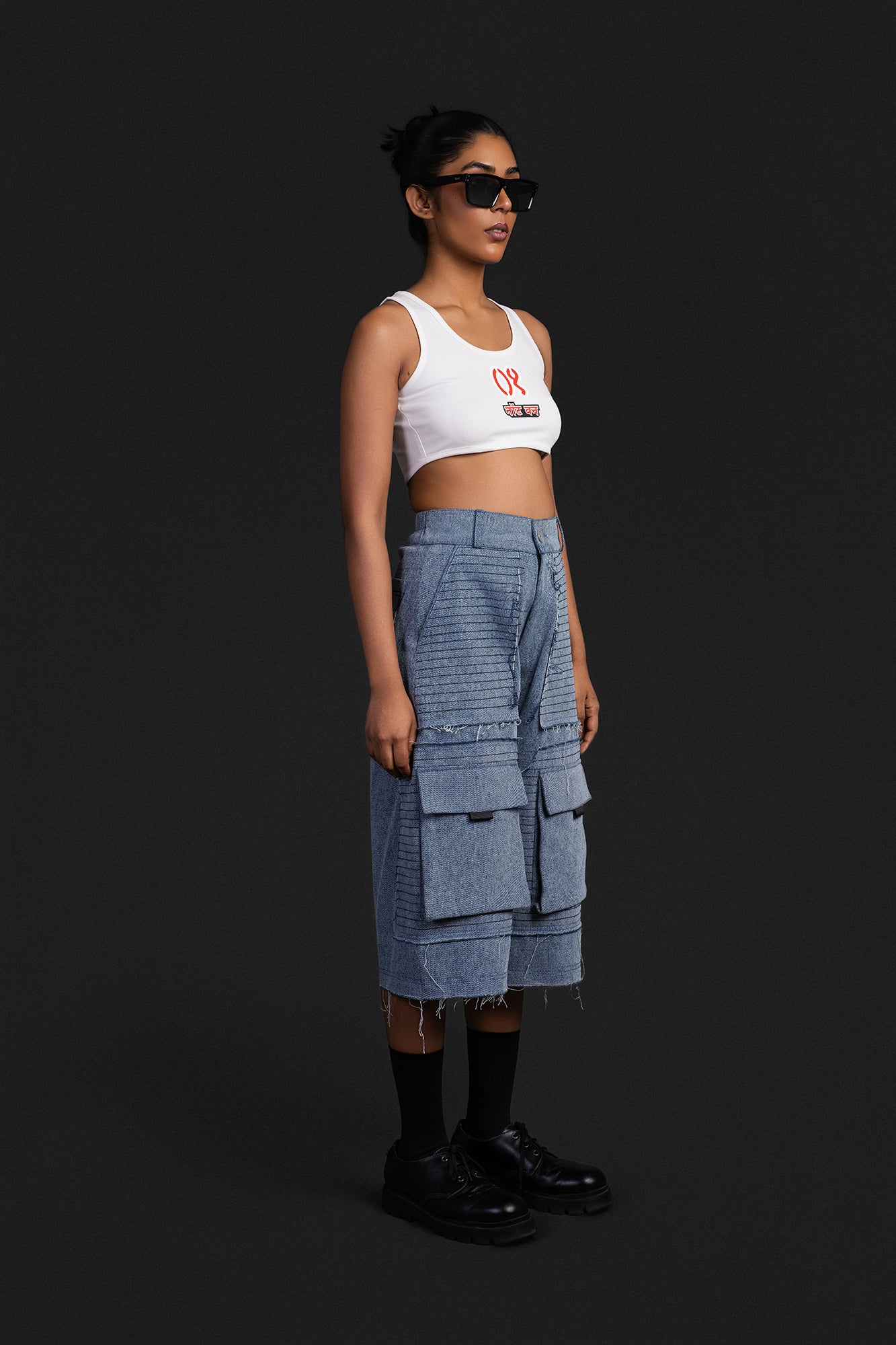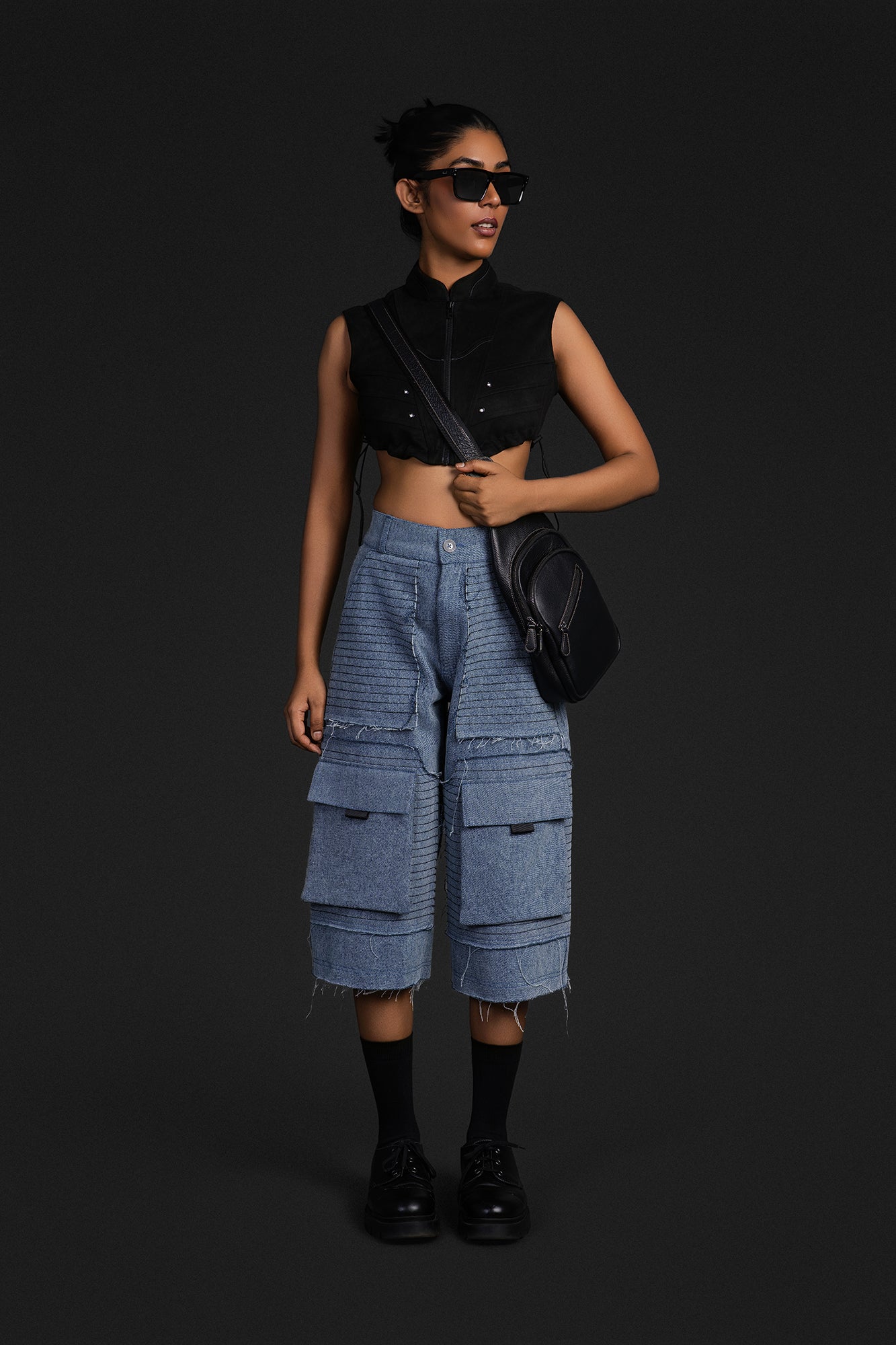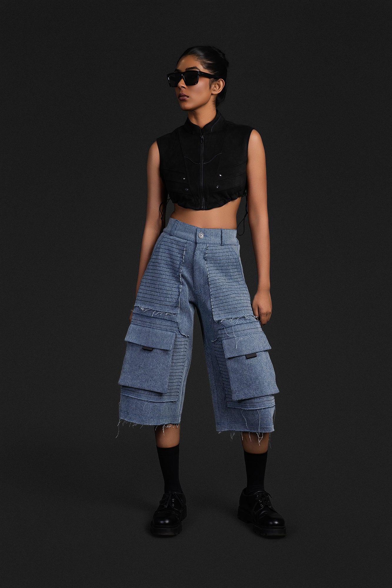 A cotton denim based shorts that offers an anti-fit, 2 cargo patch pockets on either side and have a capri inspired length.