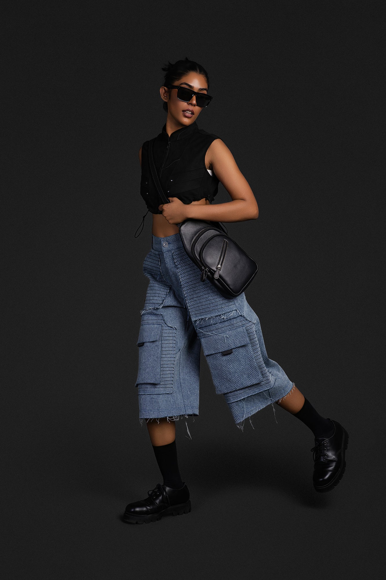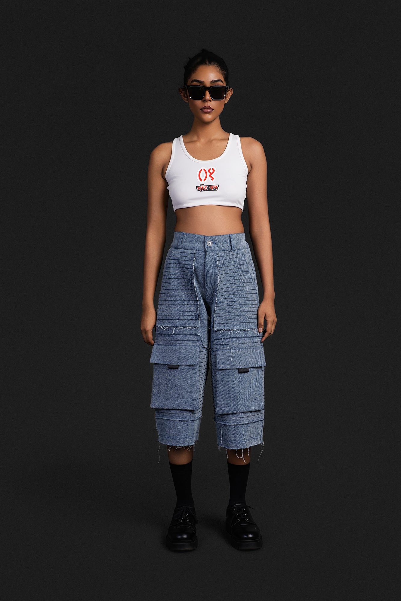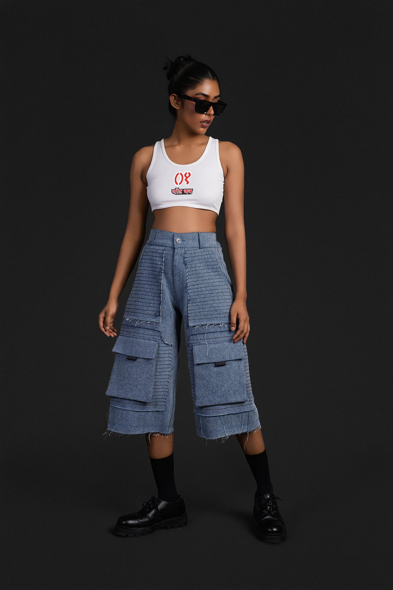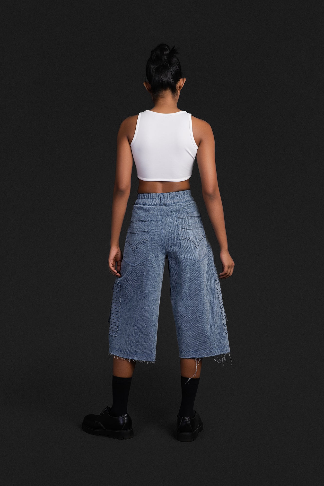 A cotton denim based shorts that offers an anti-fit, 2 cargo patch pockets on either side and have a capri inspired length.
