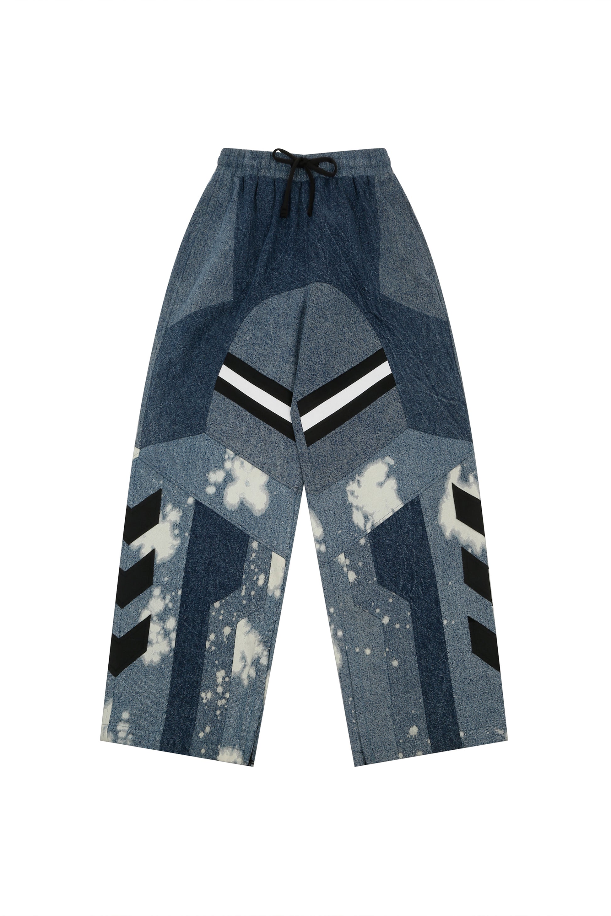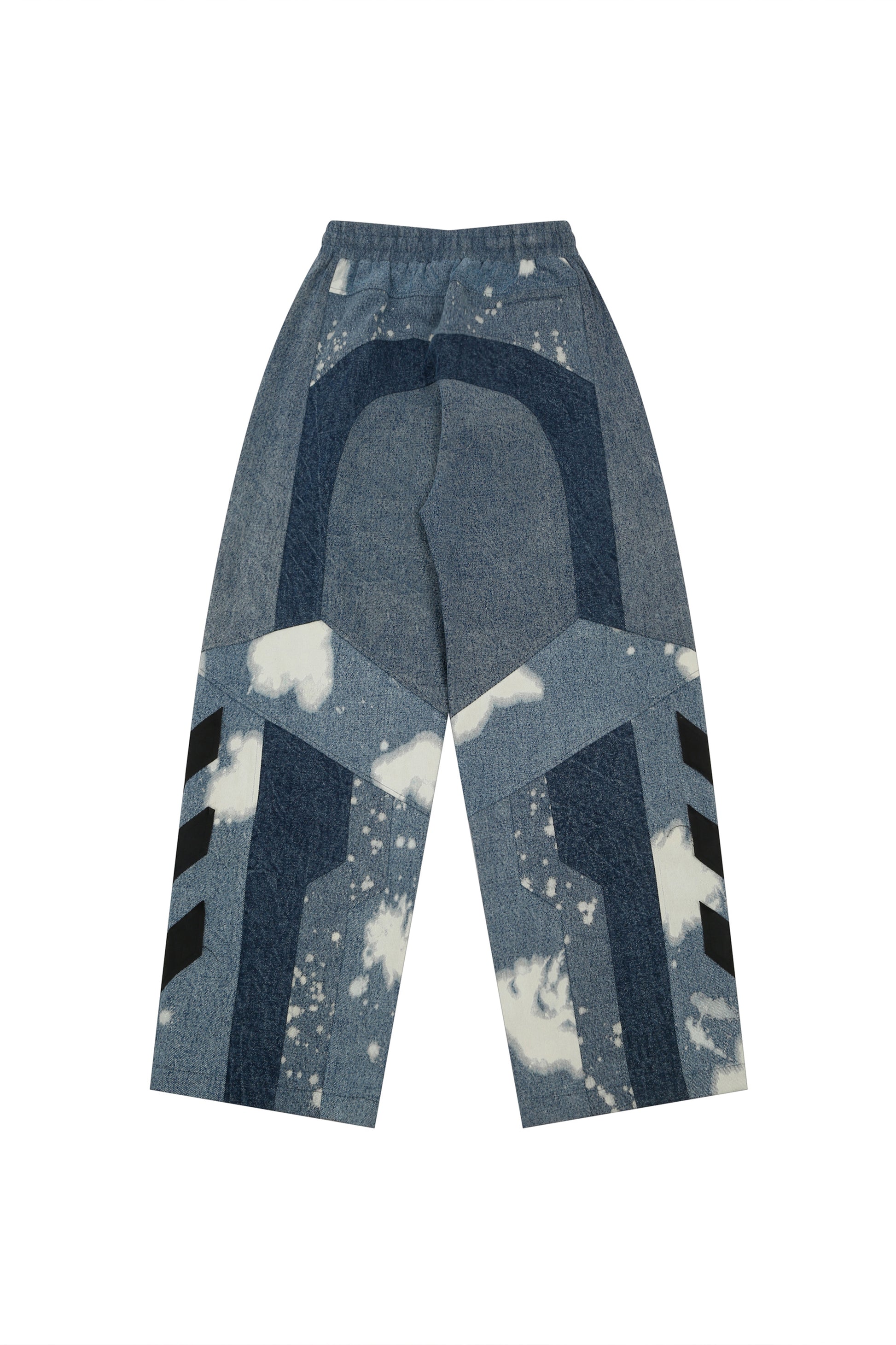100% Cotton denim with different washes are patched together to create this racing jogger. It offers an anti-fit silhouette along with bottom widening zippers.
