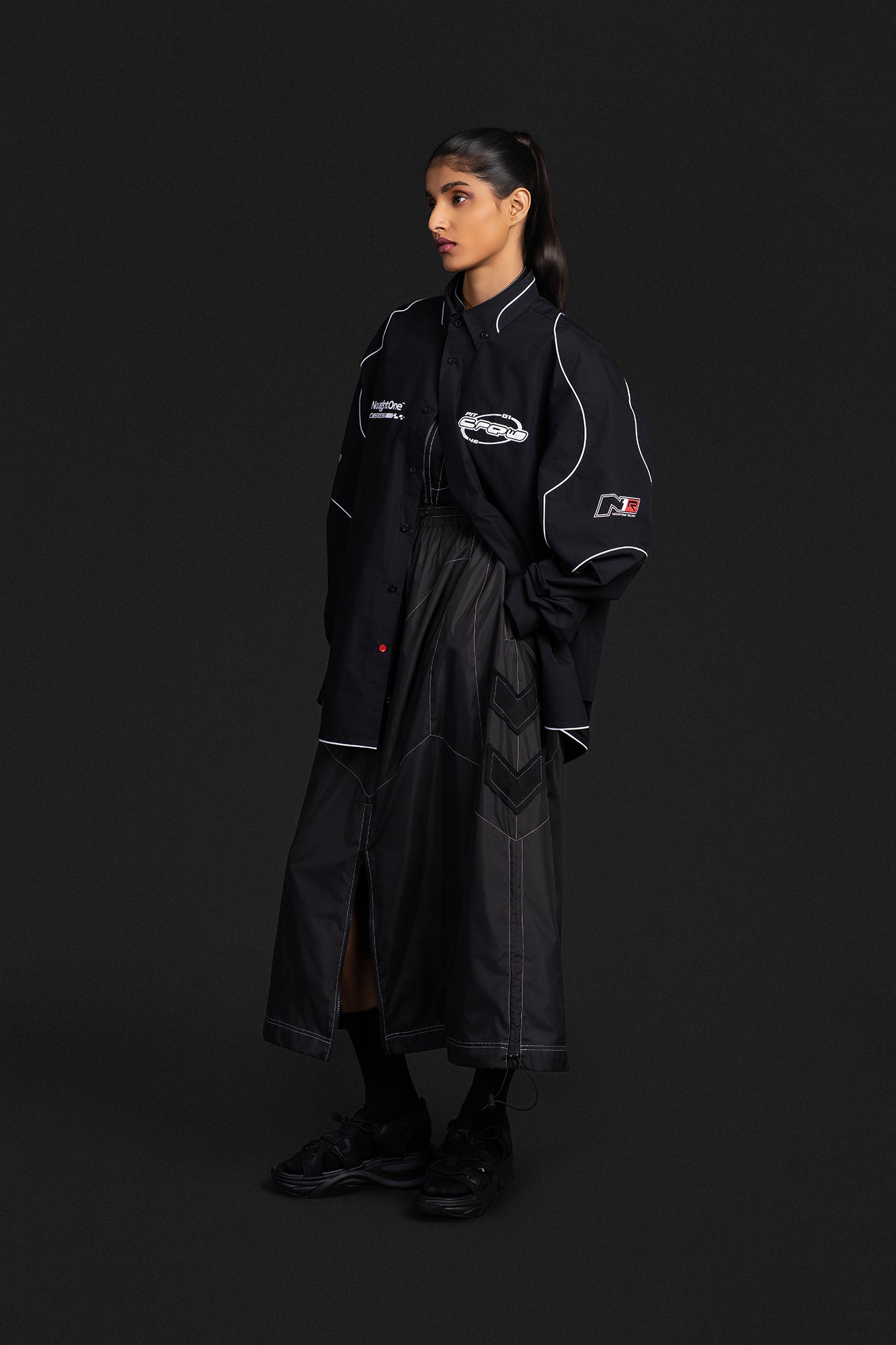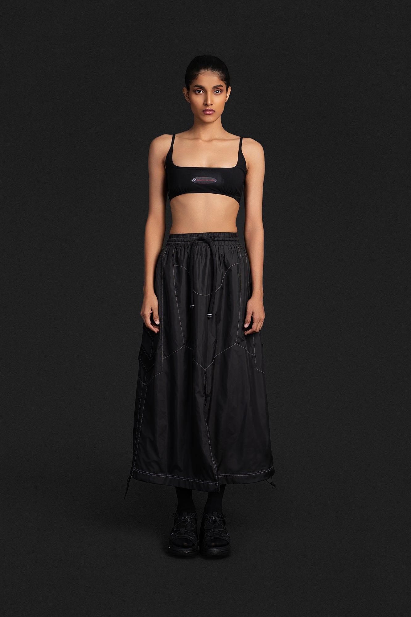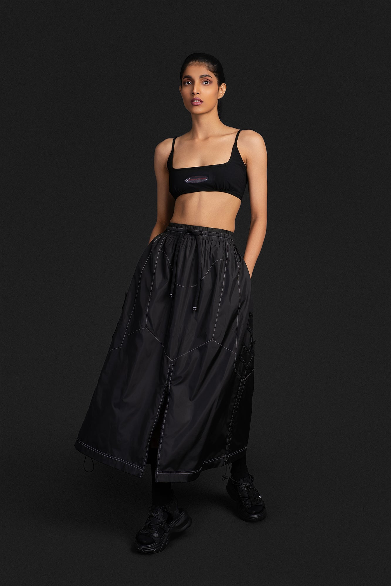 A parachute based long skirt that features panel work inspired by the silhouette of our biker pants. It has a slighter longer silhouette and offers an anti-fit with 2 zipper pockets on either side.
