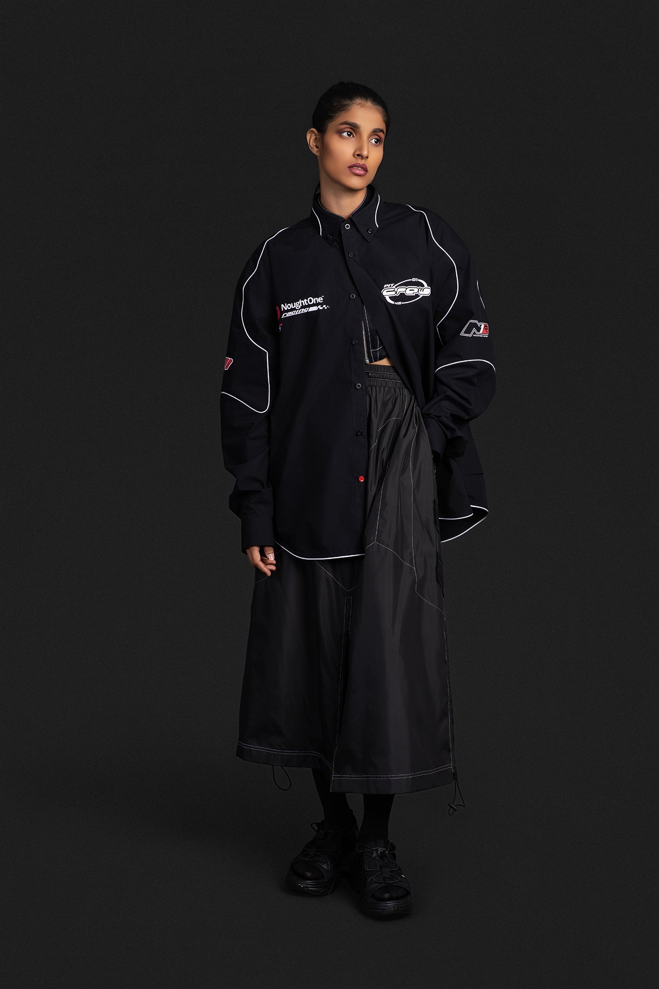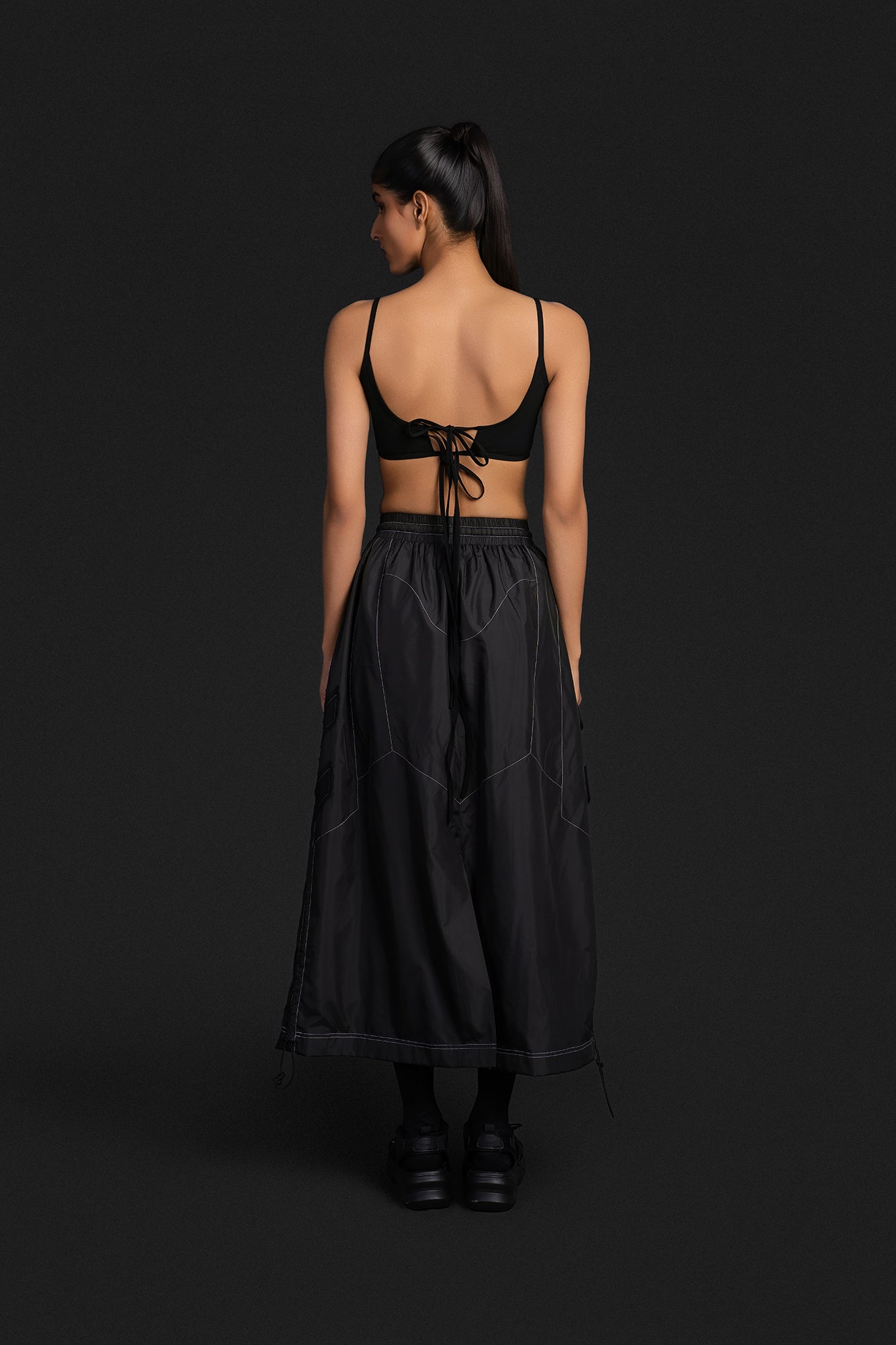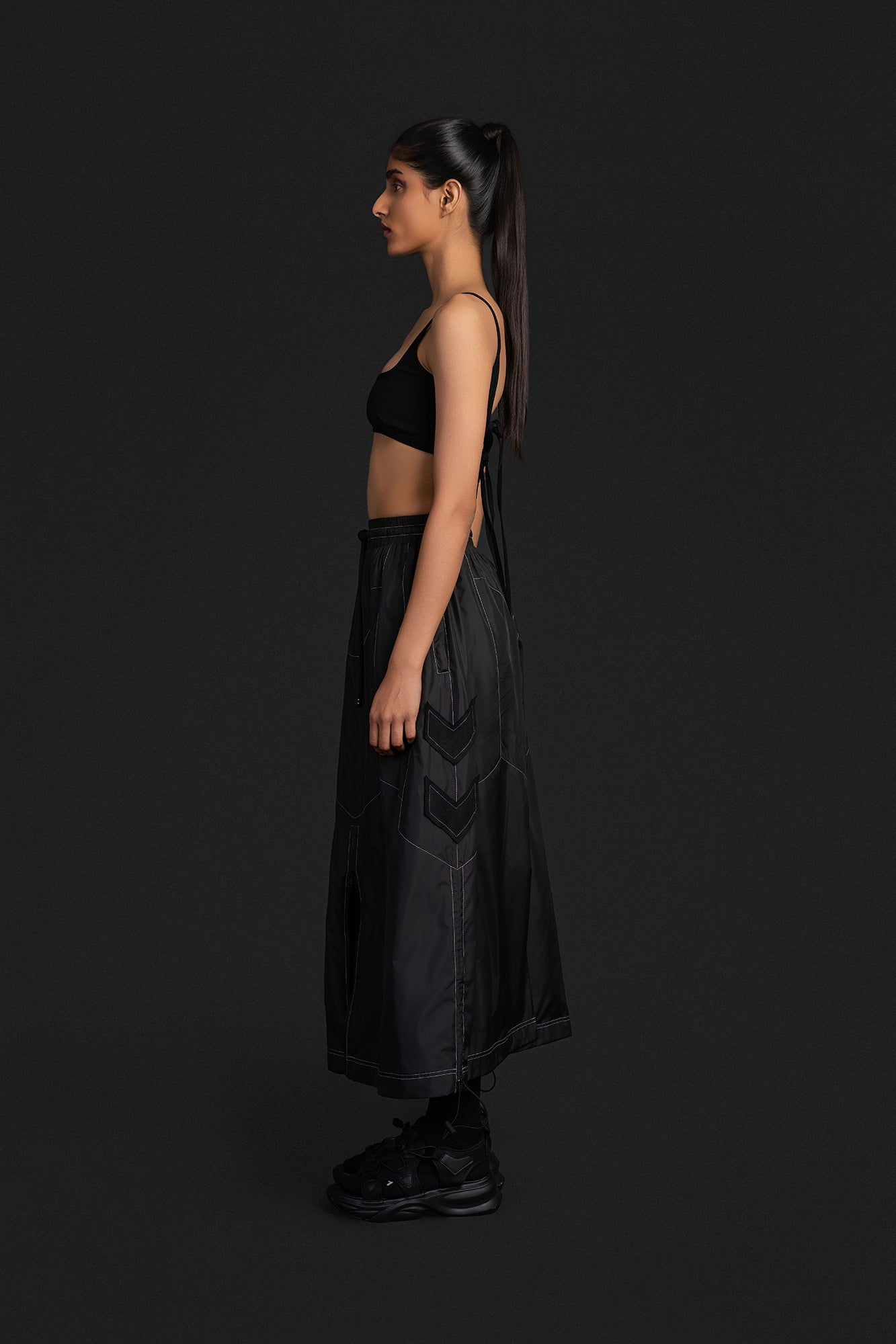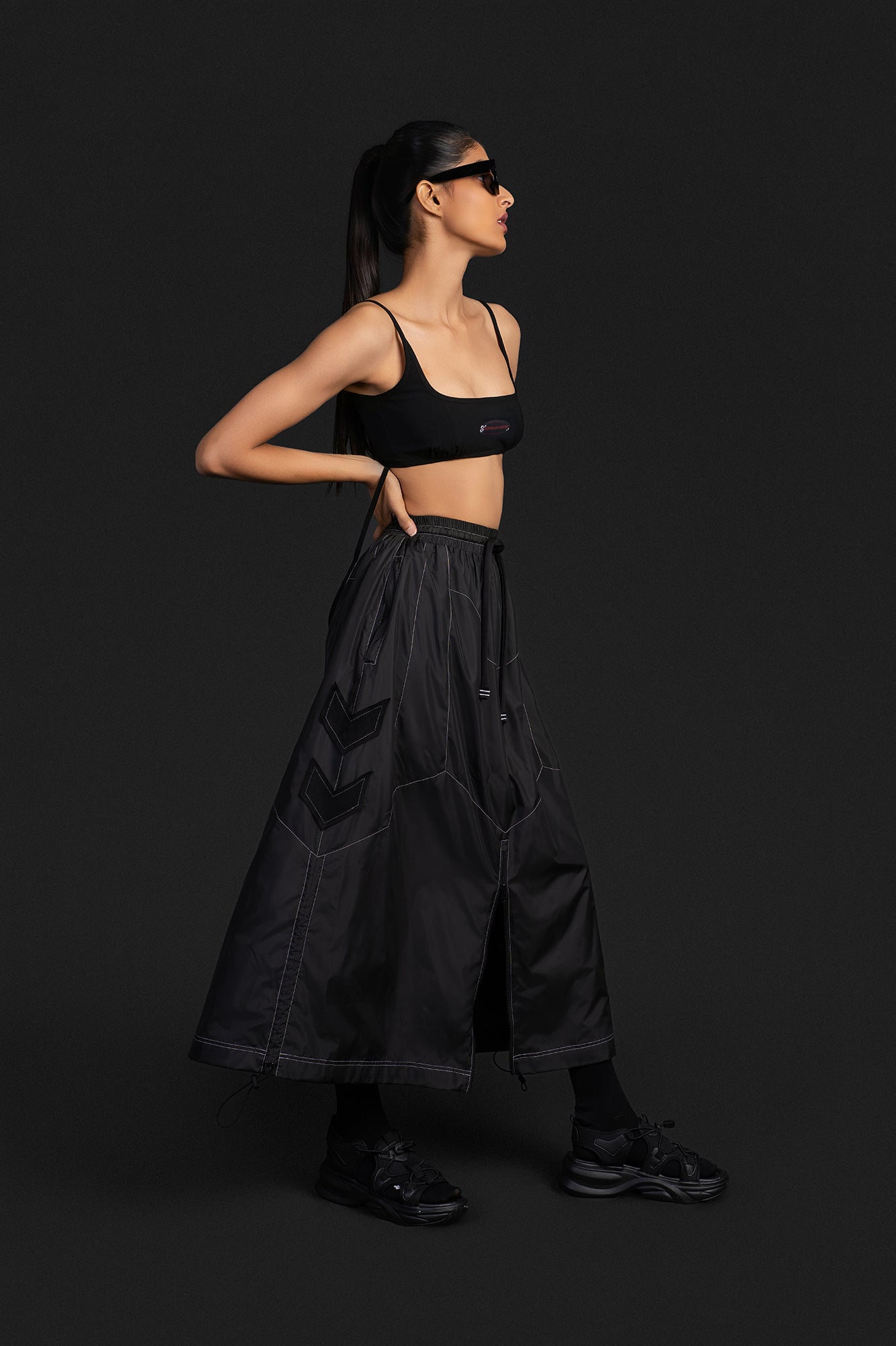 A parachute based long skirt that features panel work inspired by the silhouette of our biker pants. It has a slighter longer silhouette and offers an anti-fit with 2 zipper pockets on either side.