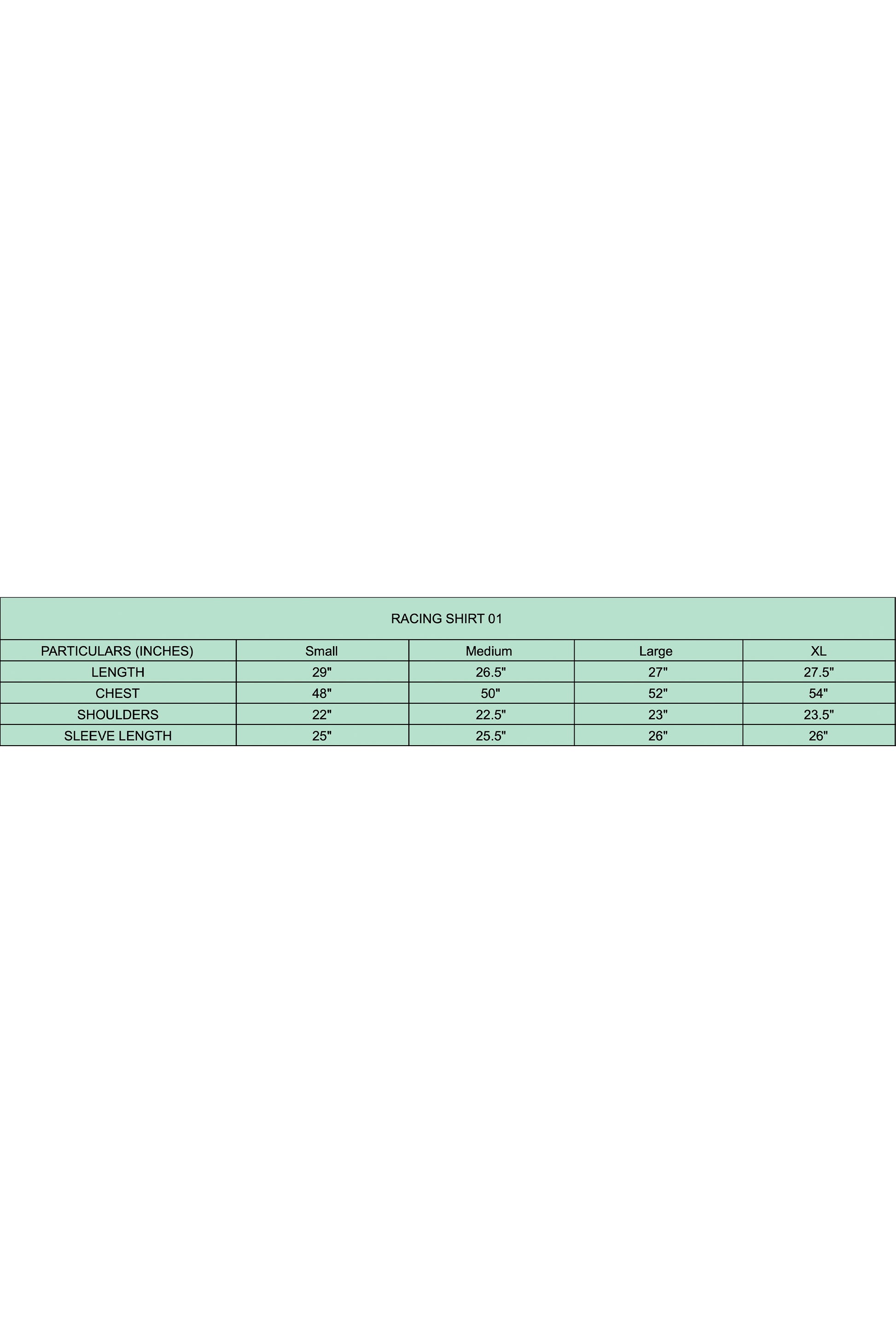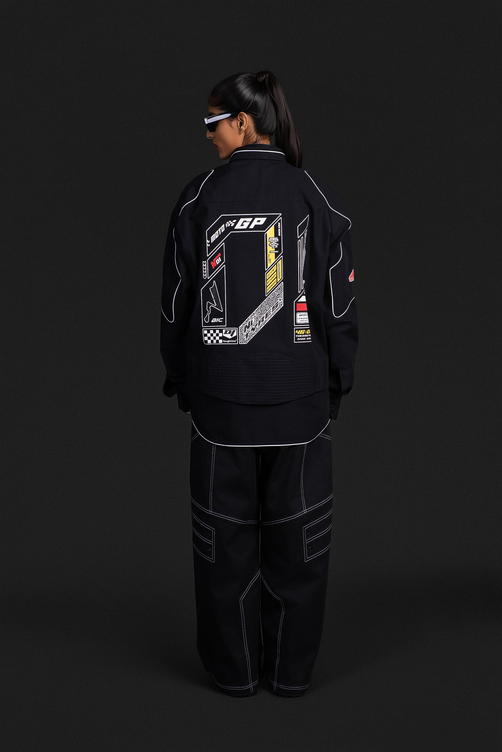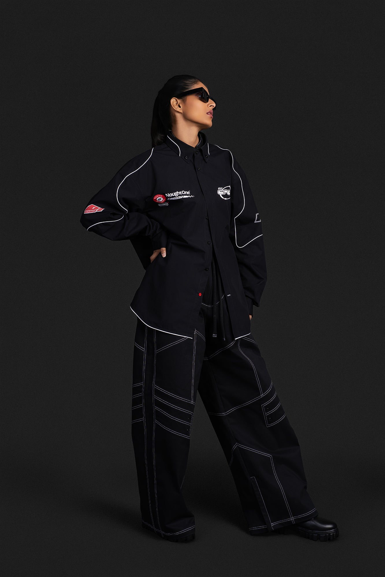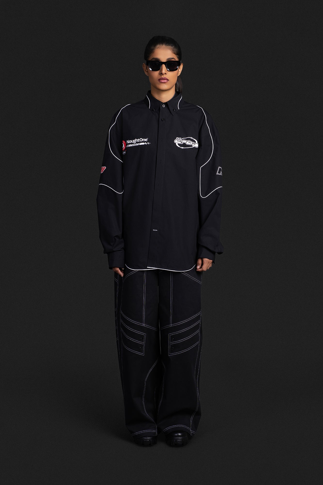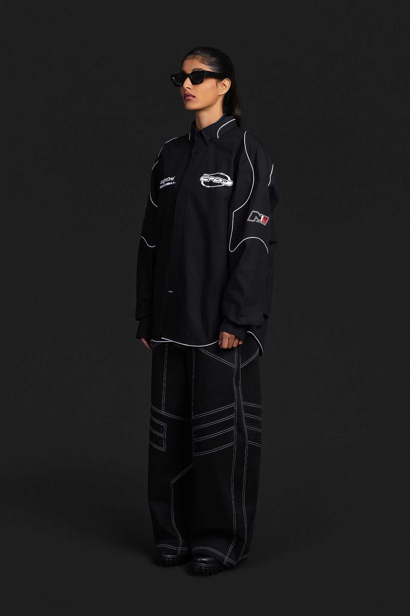 A 100% cotton poplin based shirt that features our signature racing patches along with multiple screen based racing team logos at front, back and sleeves. It offers an oversized fit, has a layered racing jacket inspired back yoke and has an elongated sleeve length(minimum till the nuckle point or beyond).