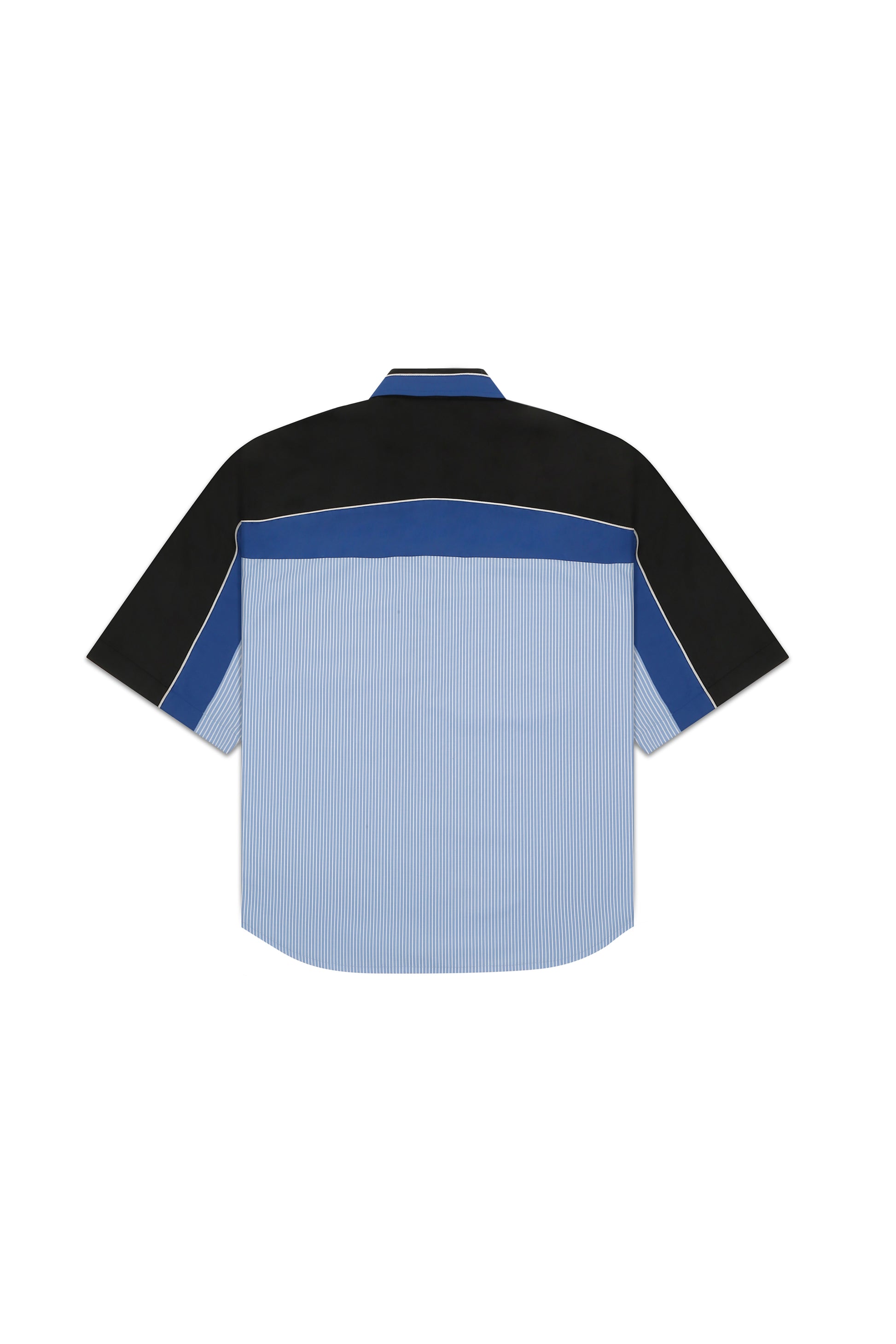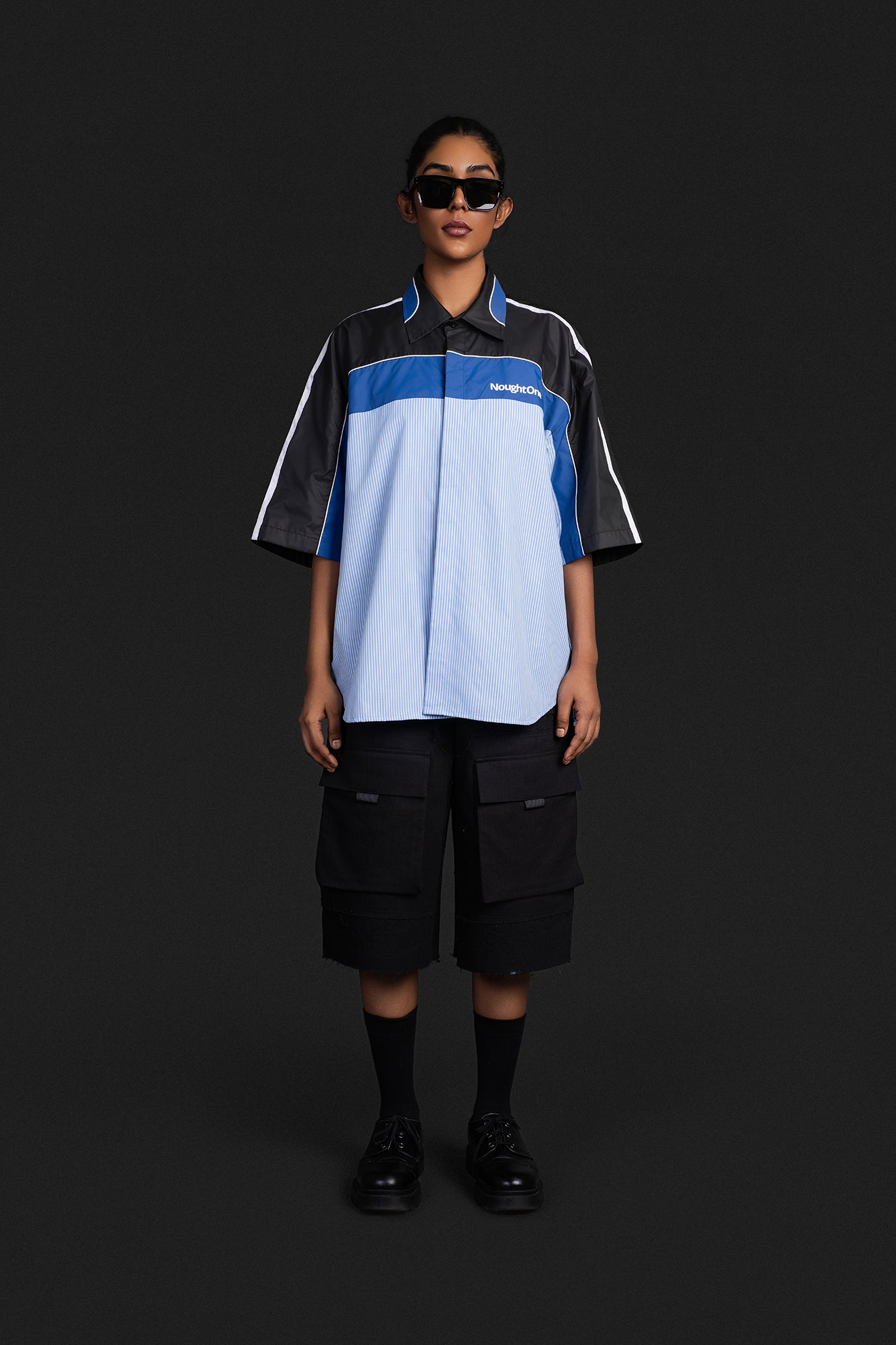 A blended cotton shirt that features coloured blocked panel work in a contrast polyester parachute fabric. It has a NoughtOne screen print at front and offers an oversized fit. It is inspired by our racing track jacket from our spring/summer 23, racing division show at fashion week.